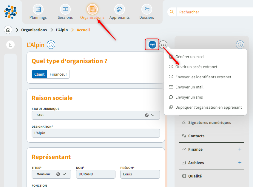 - Rendez-vous sur la fiche de votre Organisation ou Apprenant,