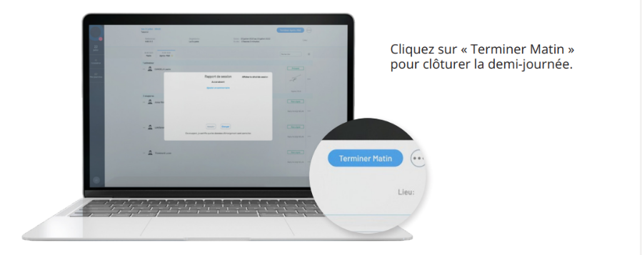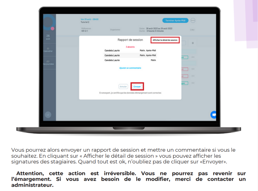 Pour chaque session, vous retrouverez le résumé de l’action de formation : l’intitulé, le mode d’organisation, la date de début et la date de fin, les heures de formations planifiées, le nombre d’apprenant, le donneur d’ordre ainsi que le taux de satisfaction. Vous trouverez aussi les informations du jour (place disponible par exemple) ou encore vos rappels.