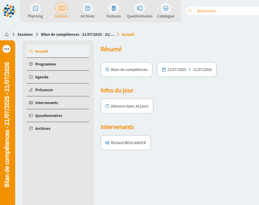 Consultez la liste de toutes vos sessions et accédez à leurs détails (participants, présences, documents, etc.).