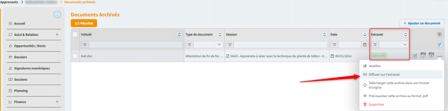 depuis la fiche de l’apprenant, accédez à l’onglet Archives Documents puis cliquez sur « Ajouter un document », et pensez à cocher « Partager dans l’extranet » si nécessaire.