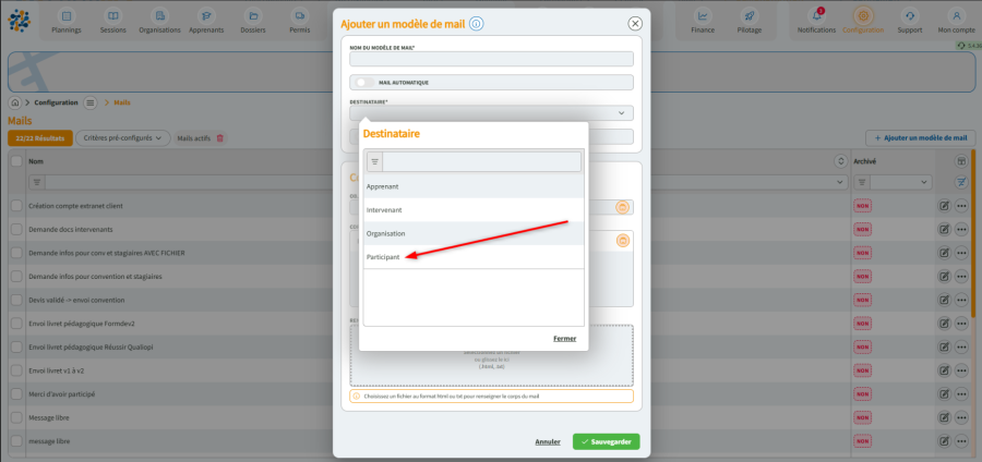 Vous pouvez à présent créer des modèles de mails transactionnels qui pourront être envoyés à l’unité ou en masse depuis une session de formation.