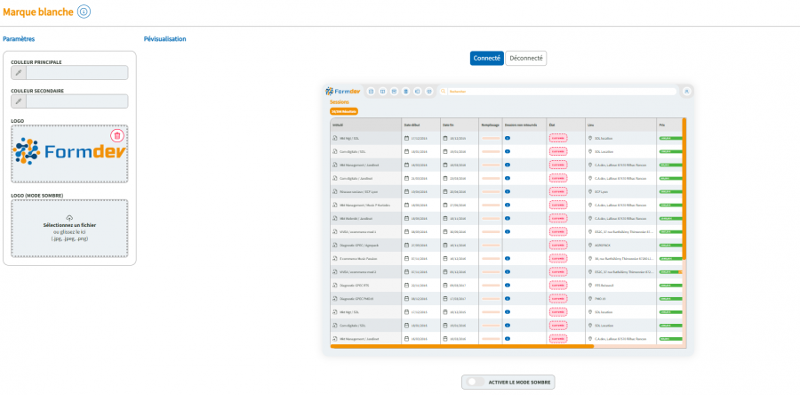 L’option Marque Blanche est une extension qui permet de personnaliser entièrement l’extranet stagiaires et clients, afin qu’il reflète l’identité visuelle de votre organisme de formation.