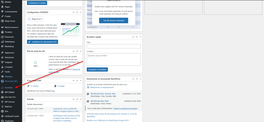 • Accès aux Réglages Formdev : Dans le menu de gauche de WordPress, une nouvelle entrée de menu "Formdev" apparaît. Cliquez dessus.