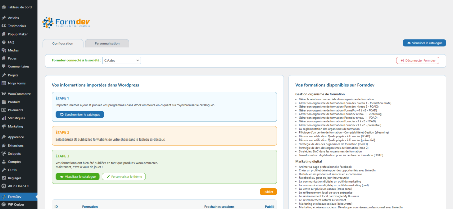 • Synchronisation Initiale, suivez les étapes (synchronisation, sélection des formations et confirmation) : En quelques secondes, le Plugin se connecte à votre Formdev, effectue une première synchronisation et récupère automatiquement :