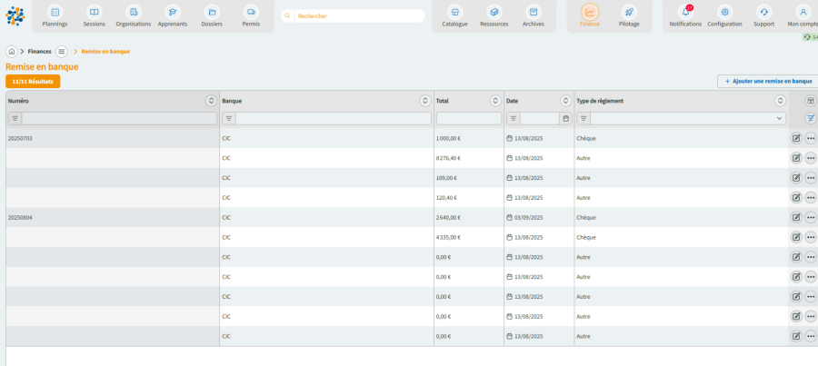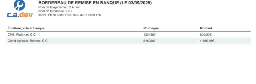Il est maintenant possible de gérer vos remises en banque directement depuis Formdev. Cette fonctionnalité vous permet de suivre la remise en banque de vos encaissements (chèques, espèces, etc.).