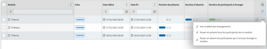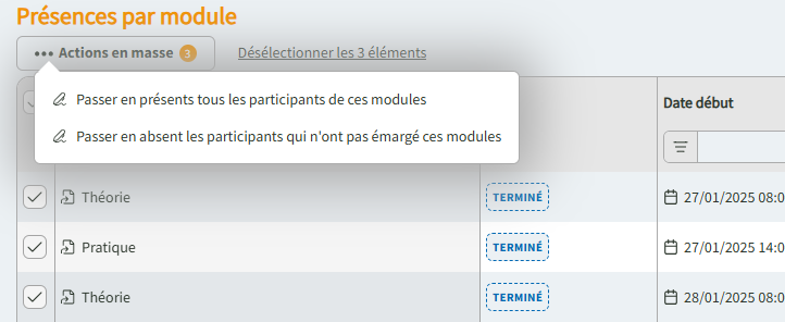 Emarger le(s) participant(s) va affecter le nombre d'heures de présence prévu du module à toute la liste des participants à ce module. Cette fonctionnalité est aussi disponible en action de masse.