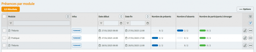 Vous pouvez aussi filtrer par modules, intervenants, ressources matérielles, et par apprenants.