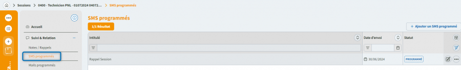Ce menu vous permet de visualiser les SMS programmés à échéance qui vont être envoyés automatiquement (ex: rappel d'un démarrage de formation)