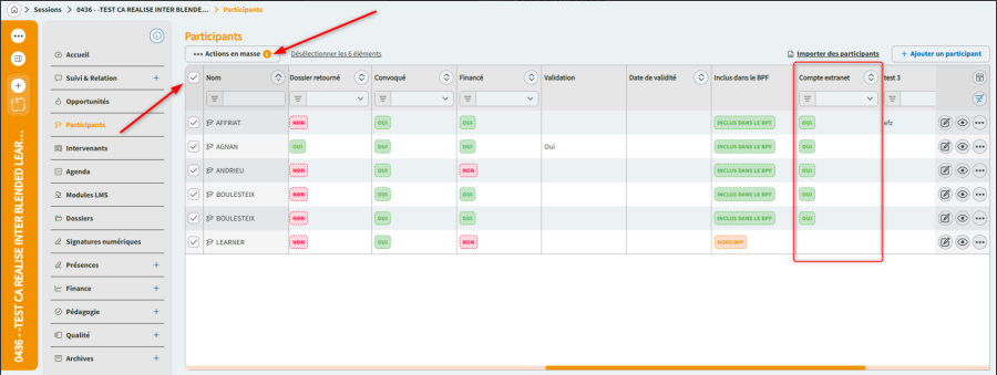 Sur une session, cliquez sur participants. Sélectionnez une liste de participants. Sélectionnez des participants ou tous les participants. Cliquez sur Action en masse. Sélectionnez Créer un accès extranet. Envoyez les mails pour que vos apprenants reçoivent leurs codes de connexion.